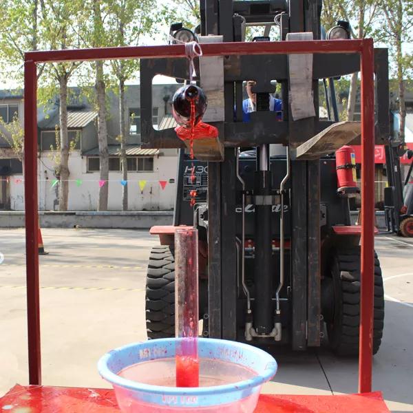 叉車倒紅酒,叉車貨叉尖端裝置一根前端稍彎曲鐵針,用鐵針頂住紅酒瓶底部,參賽選手需要駕駛叉車將紅酒平穩(wěn)倒入杯中。主要比拼選手掌握叉車的平穩(wěn)性和精細度。